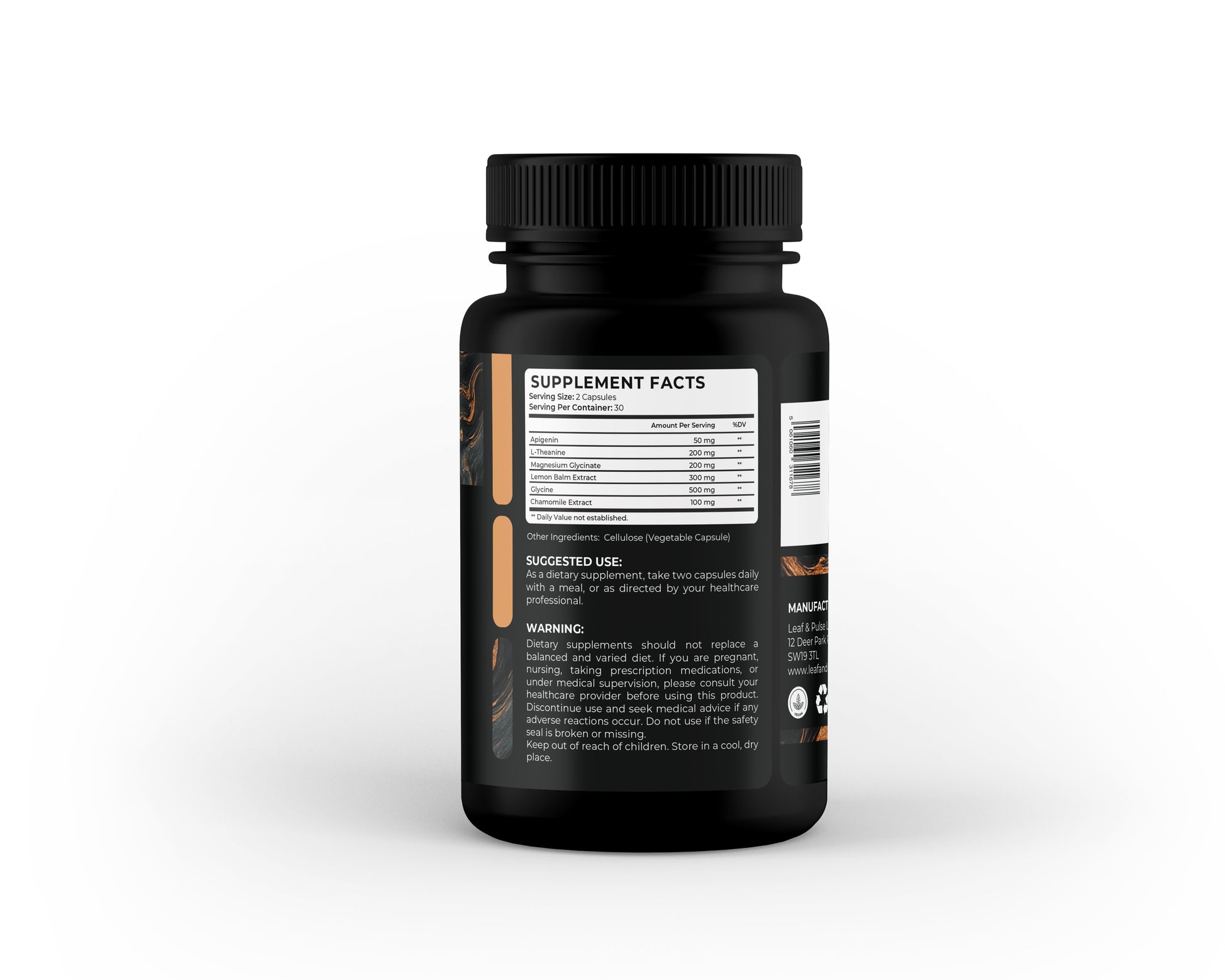 It combines calming botanicals and key nutrients including L-Theanine, Magnesium Glycinate, Lemon Balm, GABA, and Chamomile — ingredients known for their soothing properties.
